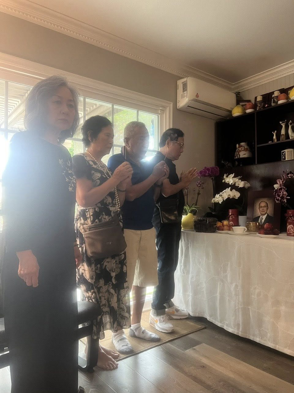 Vợ chồng Phong và anh Bách trước bàn thờ Bs Minh Khánh